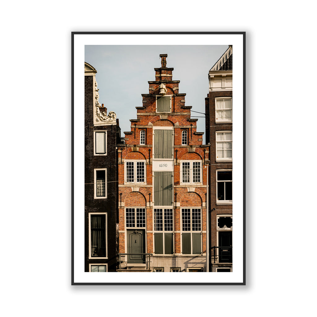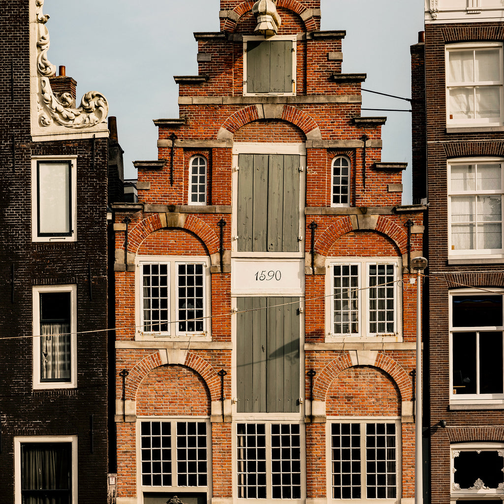 An architectural photograph showcasing the oldest residential house on Herengracht, one of Amsterdam’s most iconic canals. As proudly inscribed on its façade, this historic gem dates back to 1590. Not only is it the oldest, but it is also arguably the most beautiful, featuring all the classic elements of Dutch canal house design - ornate gables, rich red brick, and charming wooden shutters arranged in perfect harmony. A visually stunning masterpiece of Amsterdam’s architectural heritage.