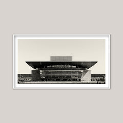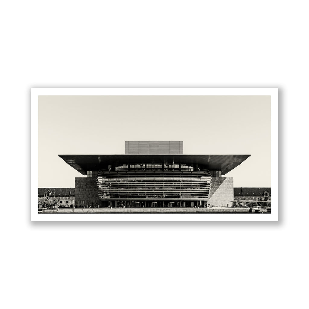 Photograph of the Copenhagen Opera House, known simply as Operaen (The Opera). Designed by a collective of architects and engineers — including Henning Larsen, Rambøll, and Buro Happold, with theatre consultants Theatreplan — the building is a striking example of modern architecture. Constructed with beige limestone, steel, and glass, it is situated prominently on the waterfront of the Inner Harbour, offering stunning views and a dramatic presence against the Copenhagen skyline.