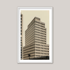 Potsdamer Platz, Berlin, Germany. A yellow-toned black and white minimal architectural photograph captures a boxlike building in Berlin’s Potsdamer Platz, where form and function intersect with striking clarity. The use of yellow-toned black and white enhances the graphic precision of the structure, emphasising its geometric simplicity and stark modernism.