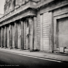 The Bank of England in the City of London. A grand and imposing monument to finance, the Bank of England stands as a symbol of institutional power and permanence. Originally designed by Sir Robert Taylor, its architectural legacy was later shaped and elevated by the visionary John Soane, who continued to develop the structure until his death in 1833. With its layered classical forms and austere grandeur, the building remains a striking embodiment of British banking history.