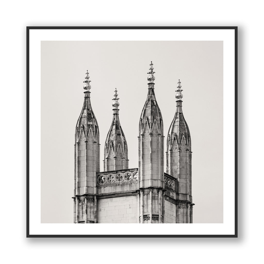 Tower Hill, London. A sepia-toned black-and-white photograph capturing the intricate architectural details of a classic Neo-Gothic building in Tower Hill, in the historic heart of the City of London. The image invites reflection on the enduring presence of Victorian grandeur amid the city’s evolving skyline.