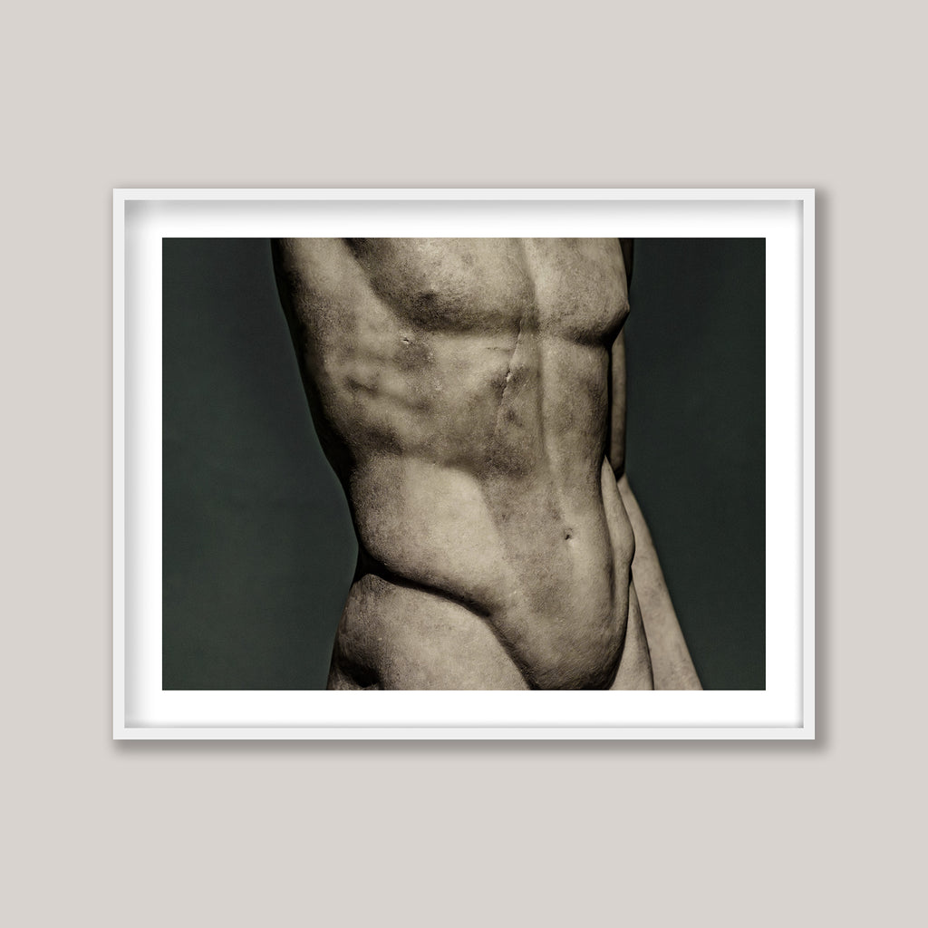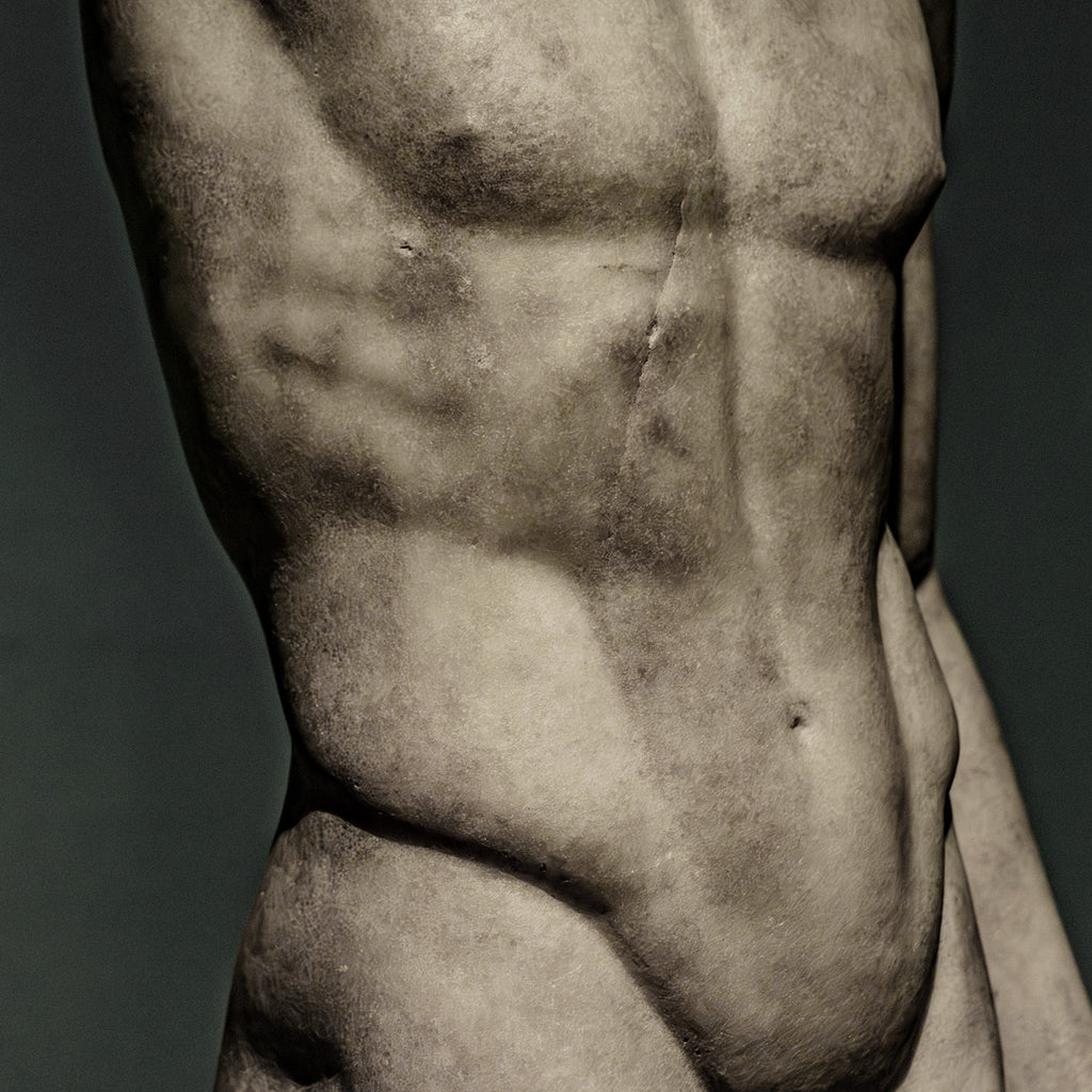 A detailed study of a marble sculpture - in fact, a copy of an Ancient Greek bronze. The athletic male figure is highly idealised; muscles, sinews, bone and youth are all celebrated here, a timeless expression of physical perfection and classical beauty.