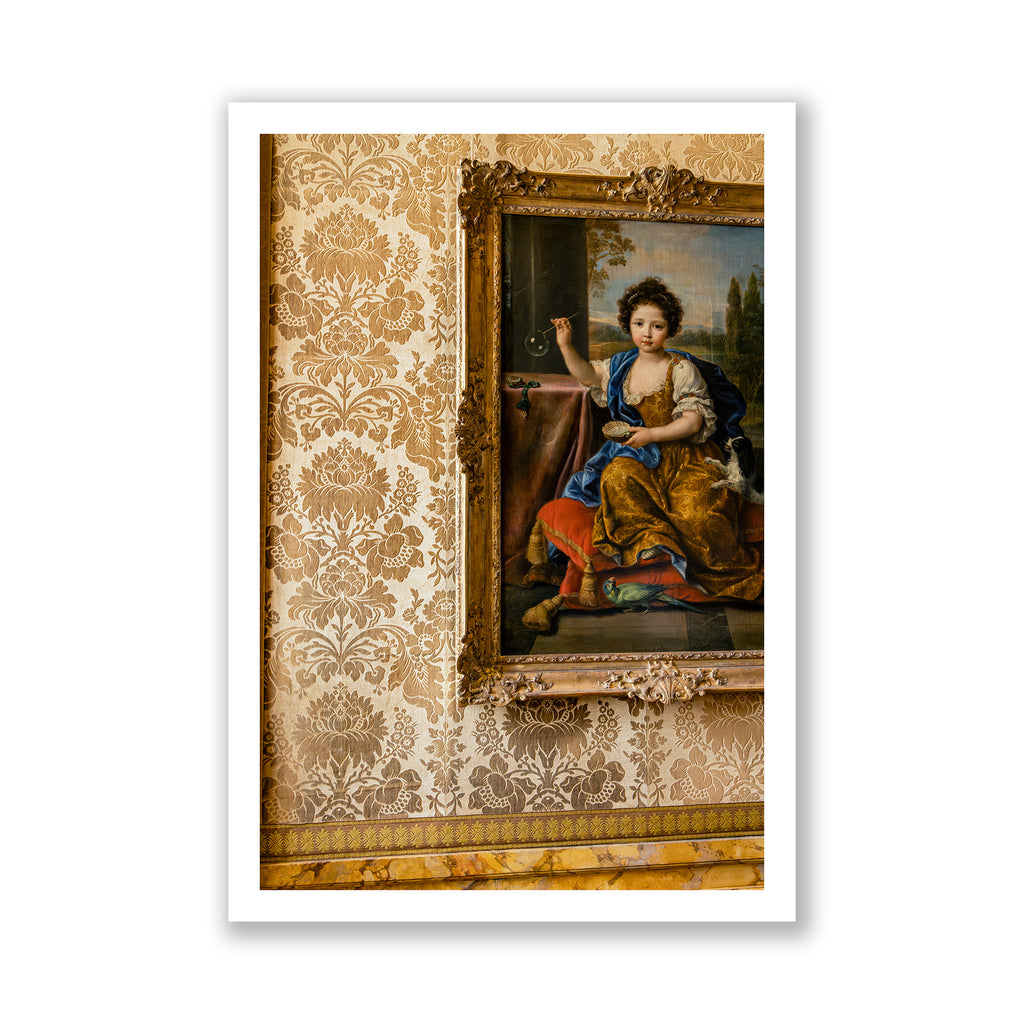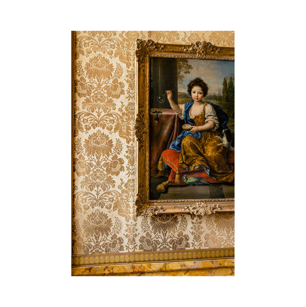 A young girl in a painting at the Palace of Versailles - Girl Blowing Soap Bubbles by Pierre Mignard I (1674). Positioned near a doorway, she gazes out from a wall adorned with exquisite cream damask - a backdrop so ornate it more than competes for your attention. Yet the quiet charm of her expression prevails.