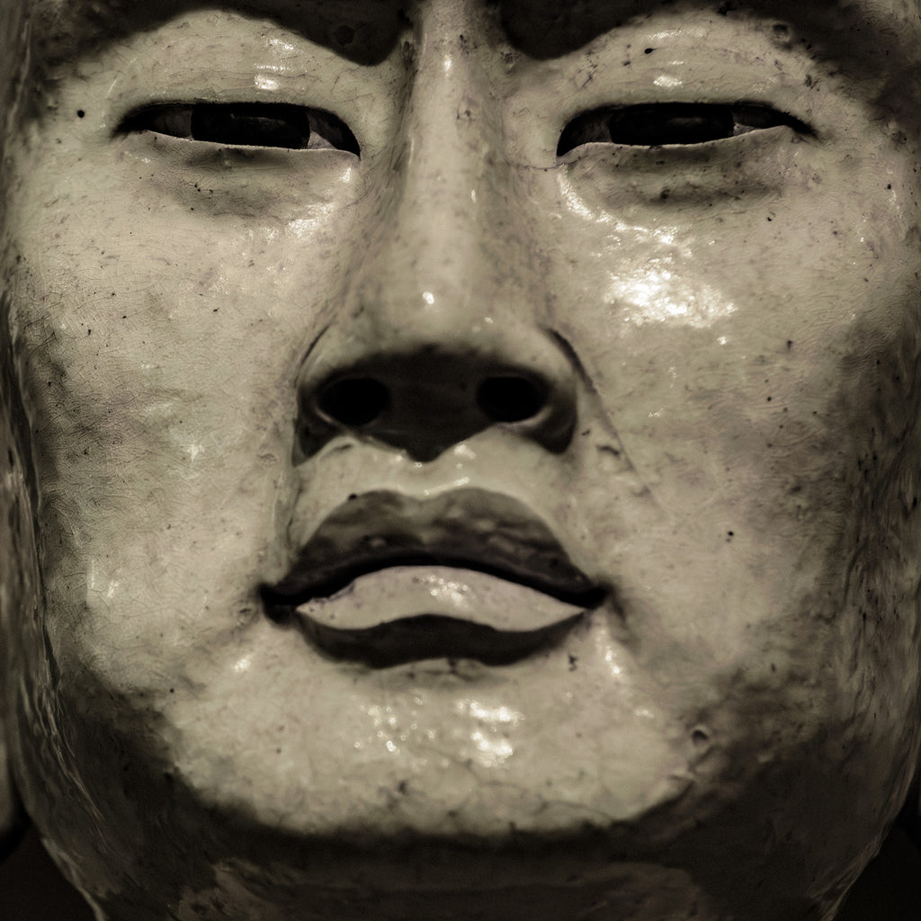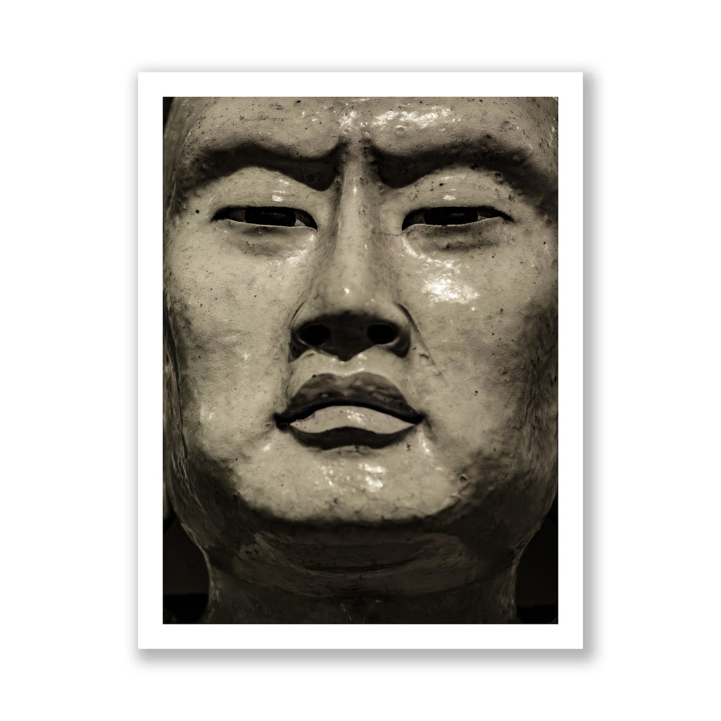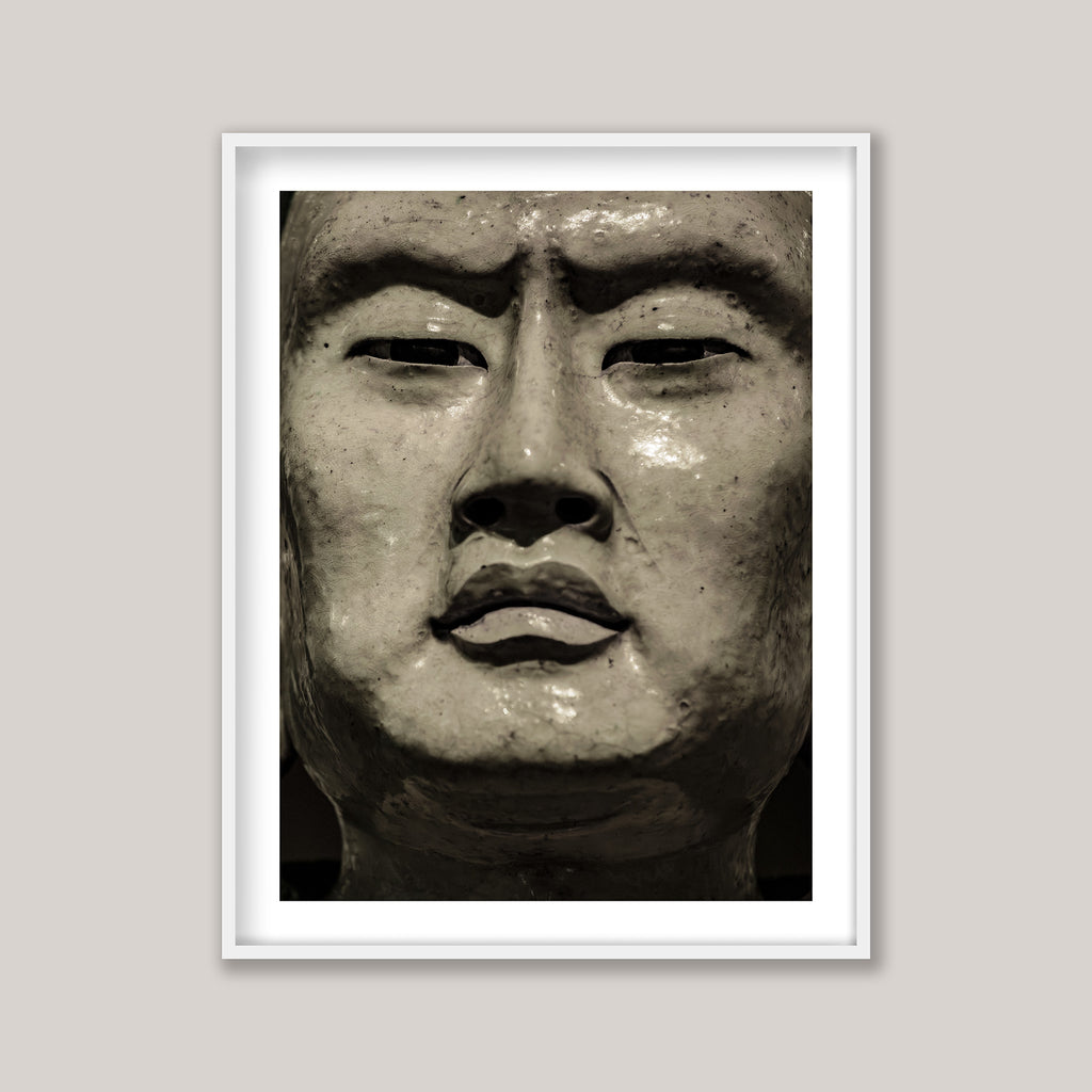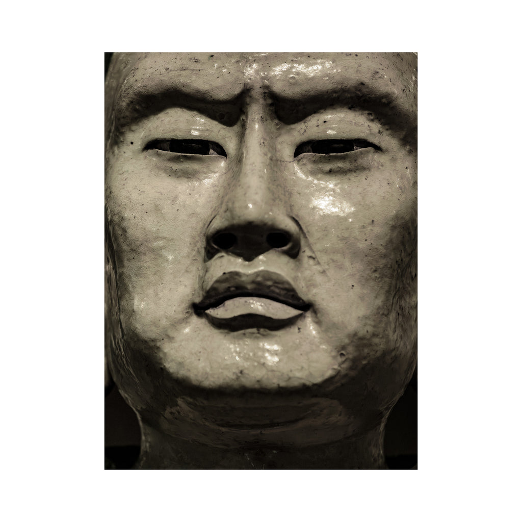 A larger-than-life ceramic sculpture of a Luohan Buddha. Every detail is characterful and precise, clearly modelled on a real person. The title Luohan is bestowed upon monks who have attained enlightenment by following the Noble Eightfold Path.